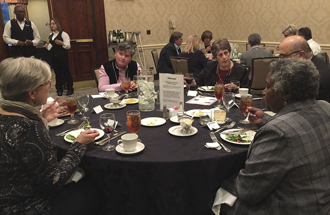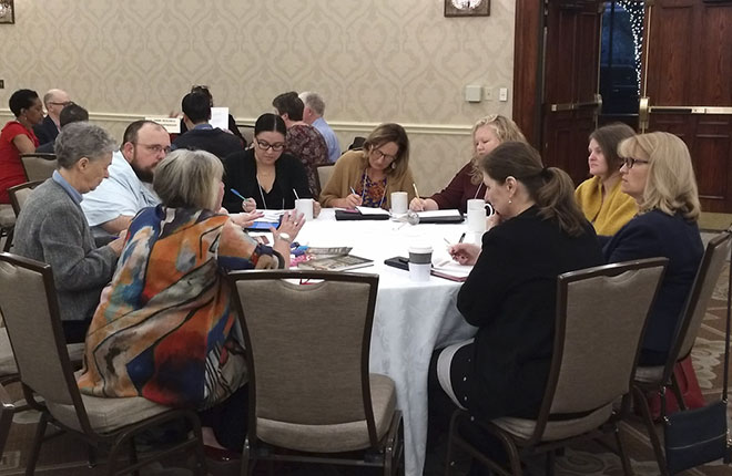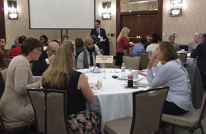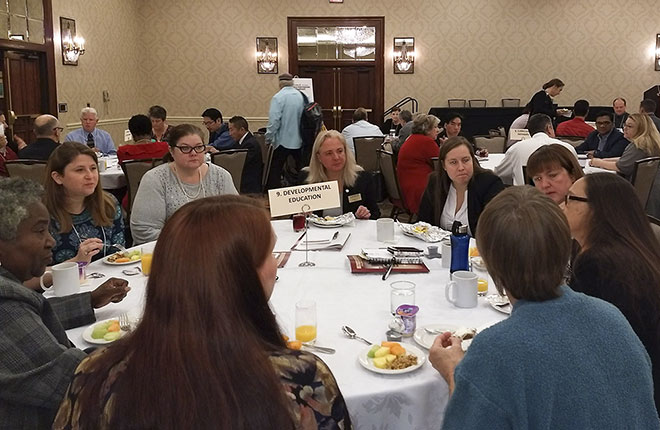 Led by colleagues, attendees met in small groups on two mornings to discuss 19 topics delving into the Yes We Must Coalition’s collaborative initiatives for collecting and using data on low-income student success, online academic sharing, undergraduate research, and curricular pathways; supporting specific students — rural, DACA, trauma survivors, at-risk; innovating the curriculum and institutional structures — Gen Ed, Developmental, scheduling, student affairs, work models, experience-based learning, peer mentoring, career decision-making.